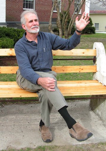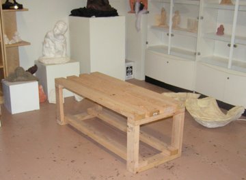 I had my apprentice put together a fake bench. I’ll create the sculpture of Dick on this bench. While at residency at Vermont College in spring of 2006. I borrowed the measuring tape from the maintenance crew and took measurements of the bench.