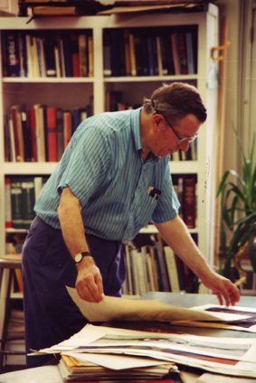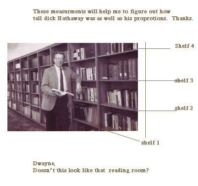 I also found and old photograph of Dick standing next to the shelves in the Noble Reading Room, at Vermont College. I called security at the college and asked them if they would check the photograph to be sure that it is from Noble and asked if they would mind measuring the shelves. I can see the knee in this picture and the bend in the arm, something that I could not see in the wedding photograph.