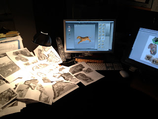There are pictures of cats all over the artists desk. She has combed the internet, the zoo photographs and other areas to find inspiration for the Grambling Tiger! She sits in her office upstairs from her studio with a desk covered in cats. The artists personal deadline for having this 3D sculpted model of the Grambling Tiger is Monday the 18th of June. She is trying to stay ahead of the game. Still waiting for some information from Grambling State University.
