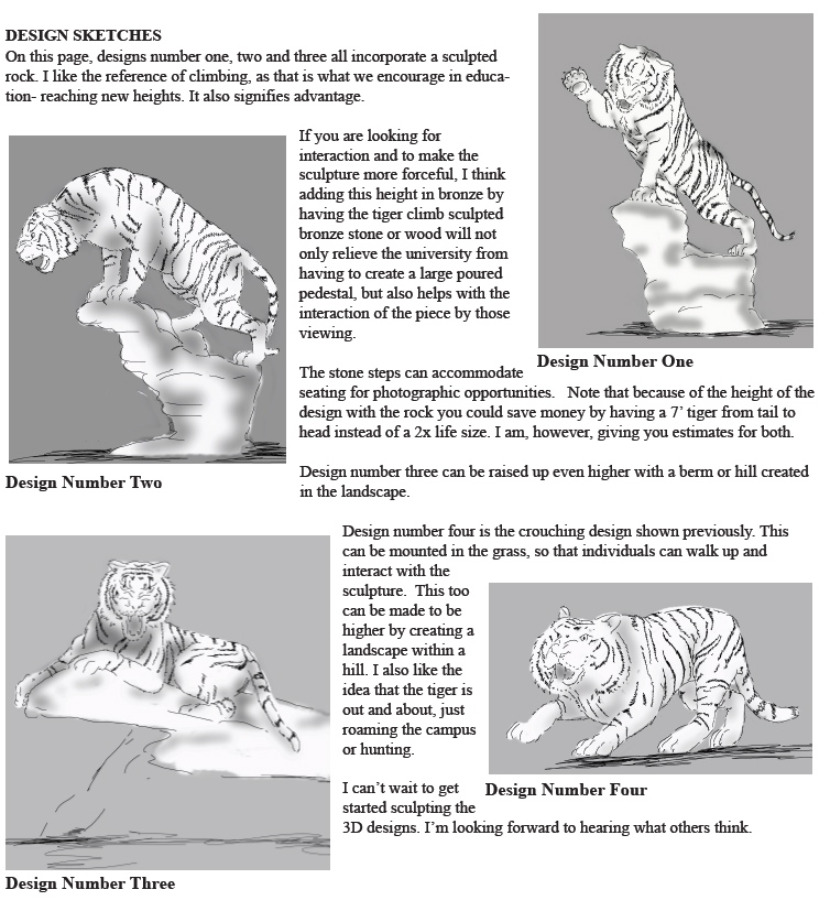 I have been working for two weeks on a final presentation for Grambling State University of the larger than life size tiger bronze sculpture. This is just a digital presentation and modifications of the design will be made as I proceed to creating it in bronze.