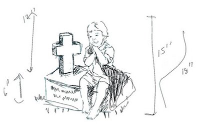The sketches you see are the boy on the granite base and a cross, that is on an angle. In one picture his blankie wraps around the cross as if it is a gift to God, in the other it hangs off. I love that the grass is tickling his toes. In the third picture I have shrunk the cross. See how it changes the feel of the piece?