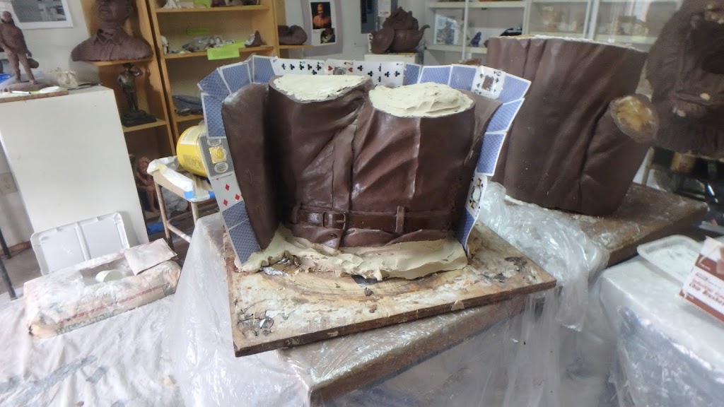 Anyone unfamiliar with the bronze casting process pretty much freaks out when they see this part. We go to great lengths to get the sculpture prefect and then we have to cut it up all over again. How do I do that? With a reciprocating saw, knives and anything I can. The many pieces are seamed up using playing cards. Some things like the dog, I will cut apart later. We did the mold of the top of the dog, flipped him and this allowed me to add detail on his belly without standing on my head to do it. The mold making process is a long one. Usually t he foundry does this process, but here at B. Mongeon Sculpture Designs Studios we do it ourselves.