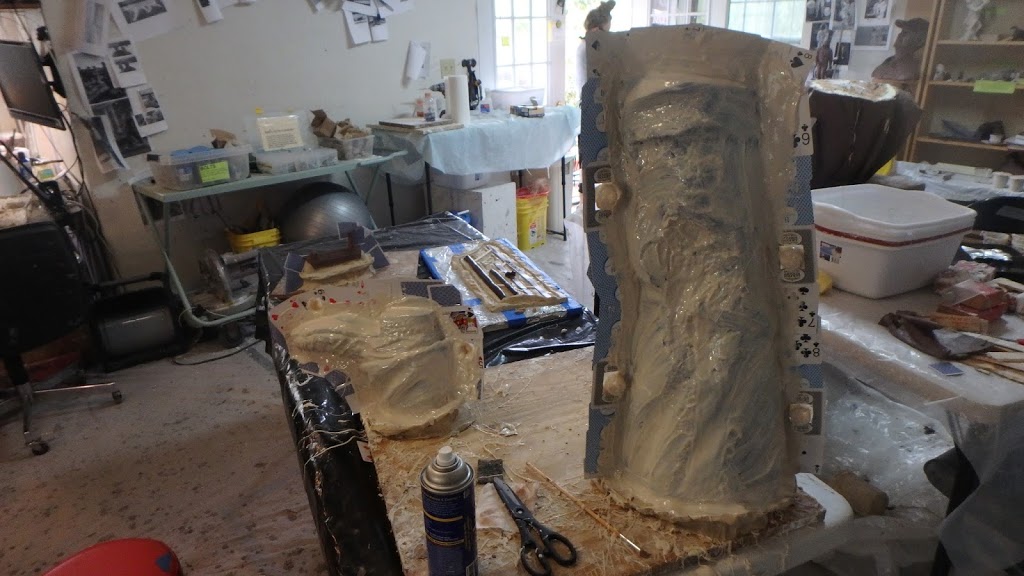 These last few weeks have been very busy, here in the studio and then at the foundry. You saw how we were cutting up John in various sections. Now it is time to make a mold. Each section has a seam, or seams. Then rubber is painted over the entire piece, section by section. After 4 layers of rubber, plaster has been added. This is all a part of the foundry process. The final rubber molds are cleaned and sent to the foundry.