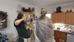 Miguel Macia works carefully at his foundry. We have seen all of the work that has gone into the sculpture up to this point. It has its final patina and so great care is taken not to scratch the art.