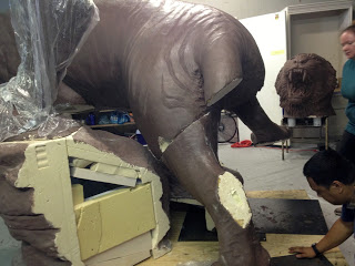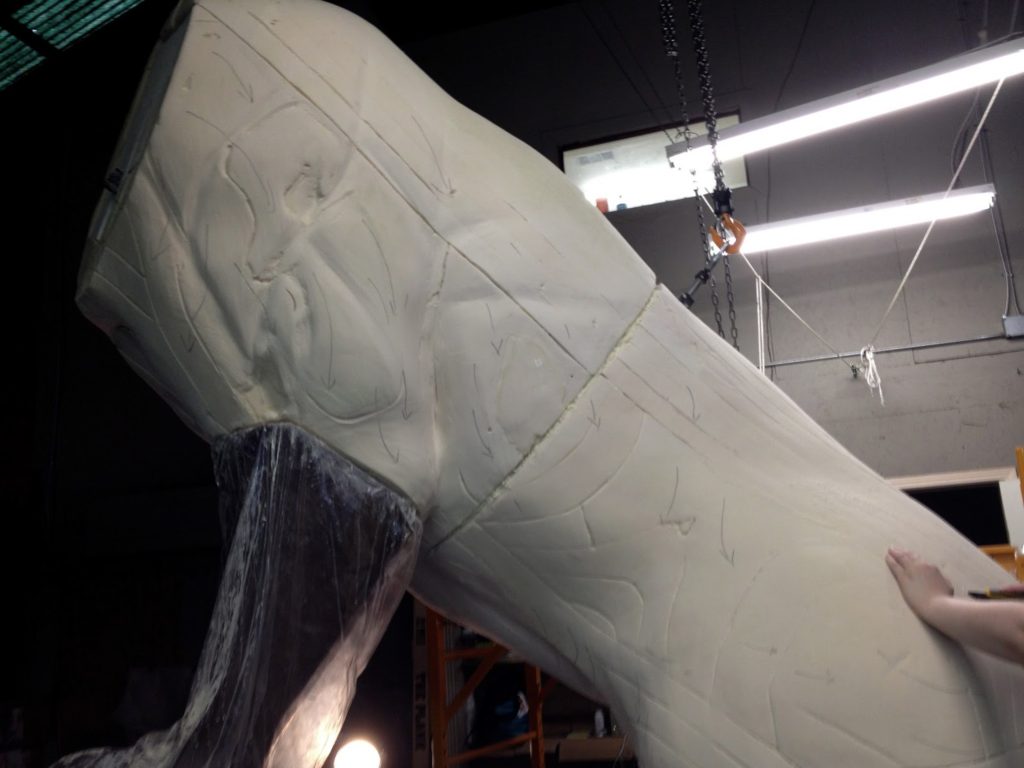 I’m paying close attention to the weather report these days. In Houston it is always hotter than it appears in the weather report. Some say that is because of our humidity. I must tell you, being in a metal warehouse with no AC it is even hotter. Yesterday, as we worked on the clay, we did not even need a torch to make it malleable That makes me a bit worried. I’m glad the tiger is swinging from the winch instead of up in the hottest part of the warehouse. This will soon change. We need to put the tiger back up for approval. We are working diligently to get an approval of the sculpture as soon as possible. Once it is up in the air it is best if it does not have to stay there long. We hope to have approval this week. Then we can take apart the pieces and bring some of them back to my air conditioned studio to get them ready for the foundry.