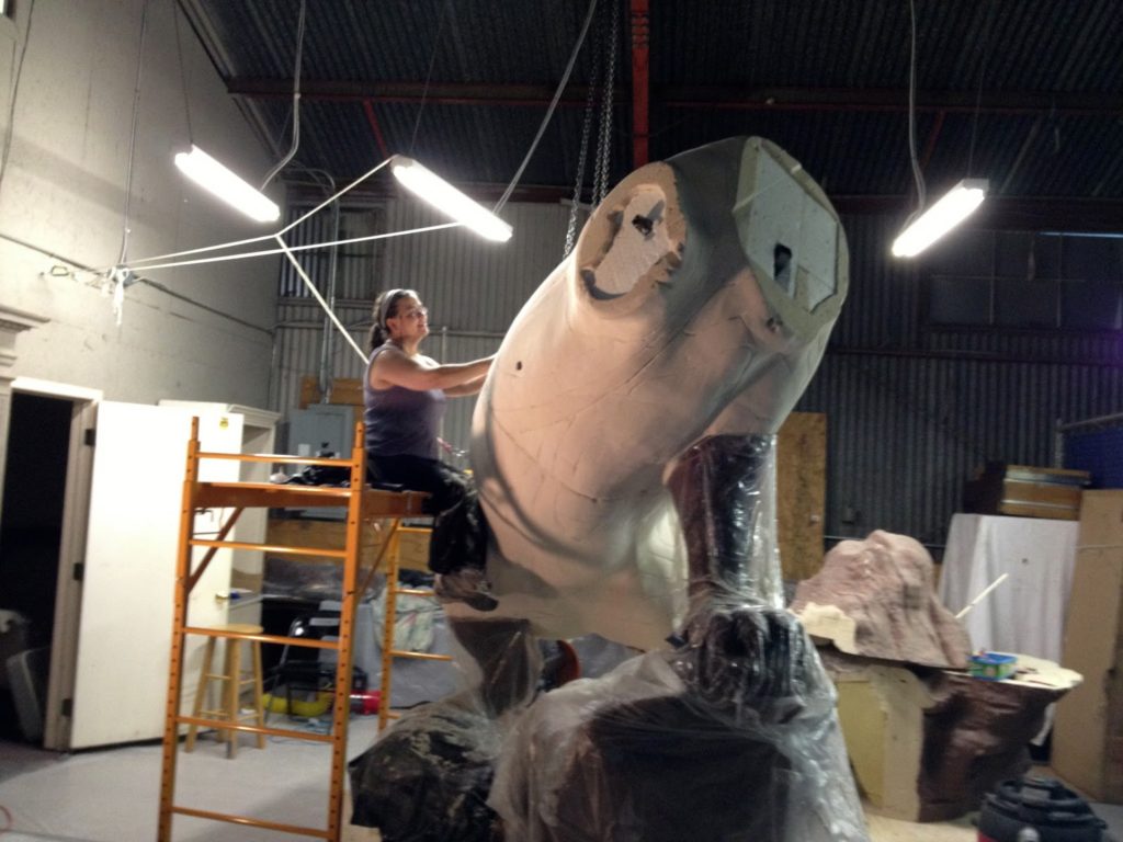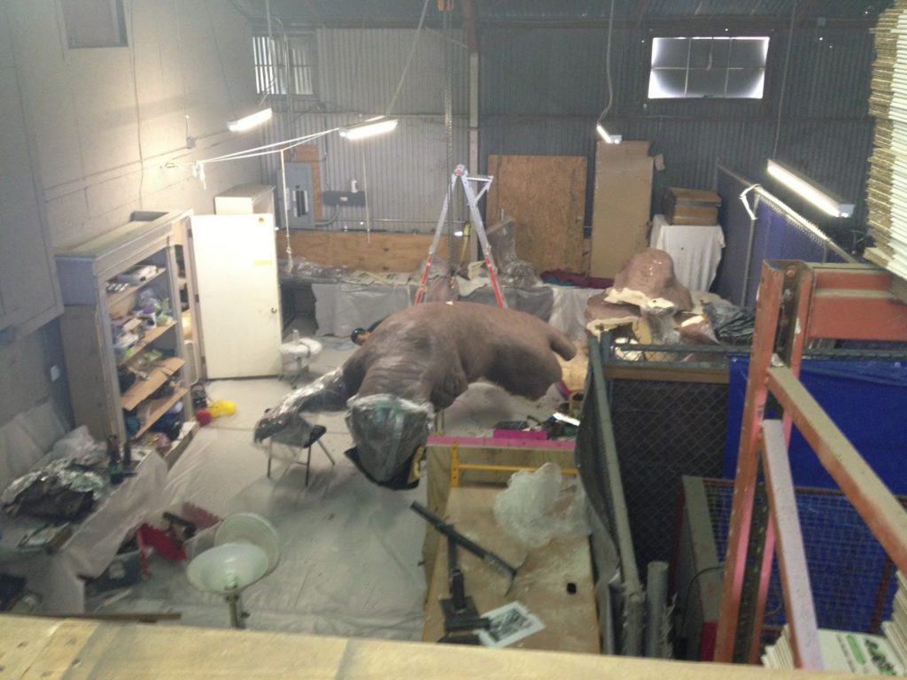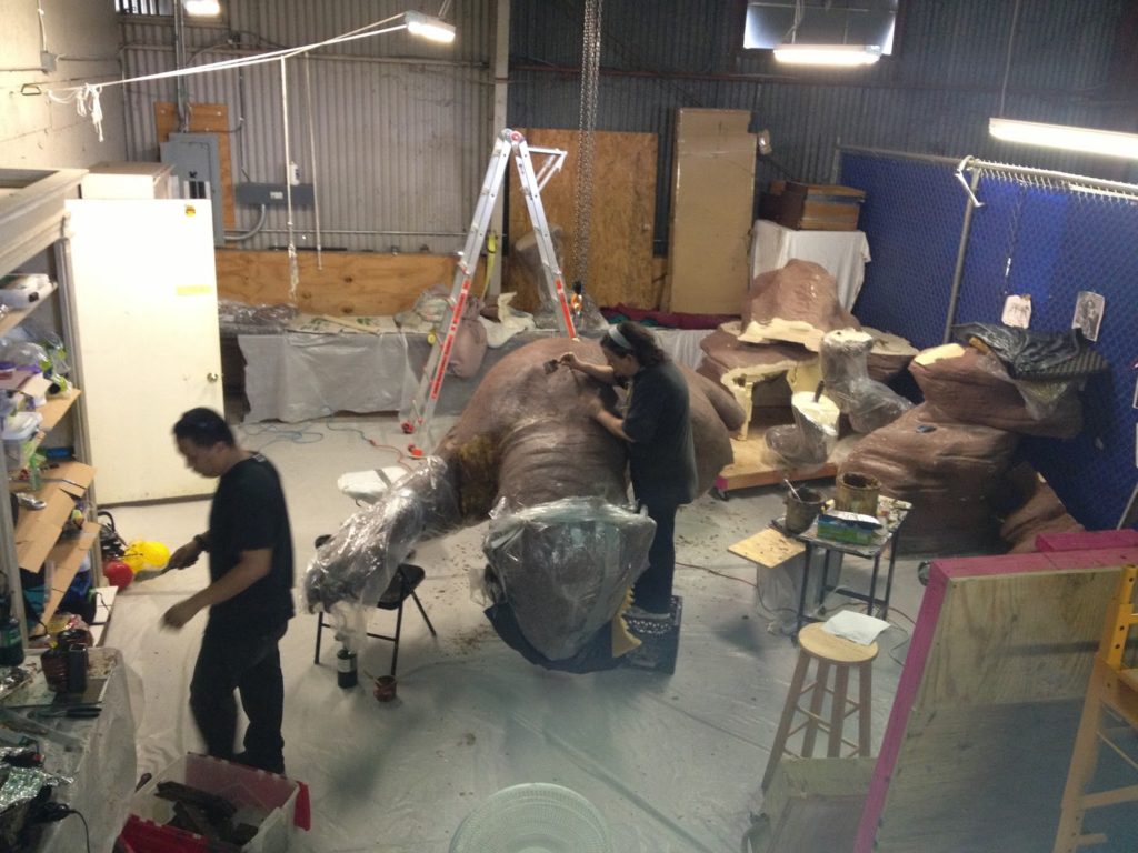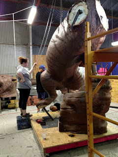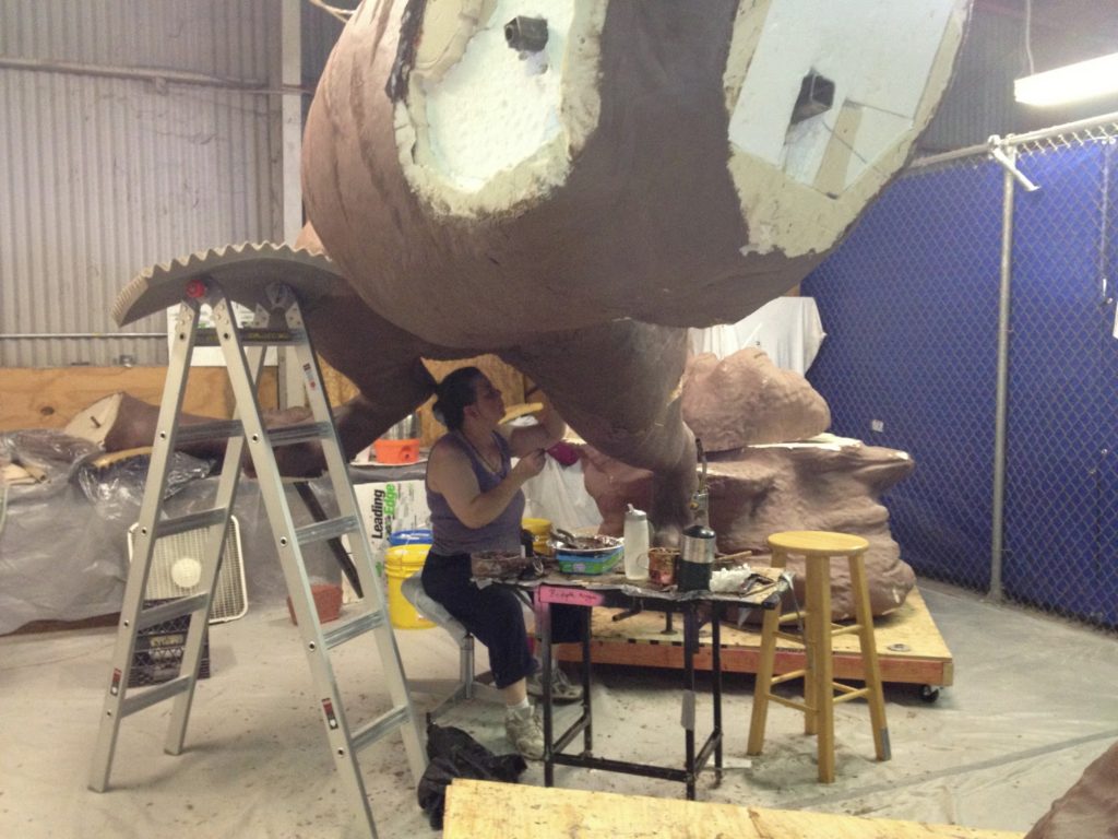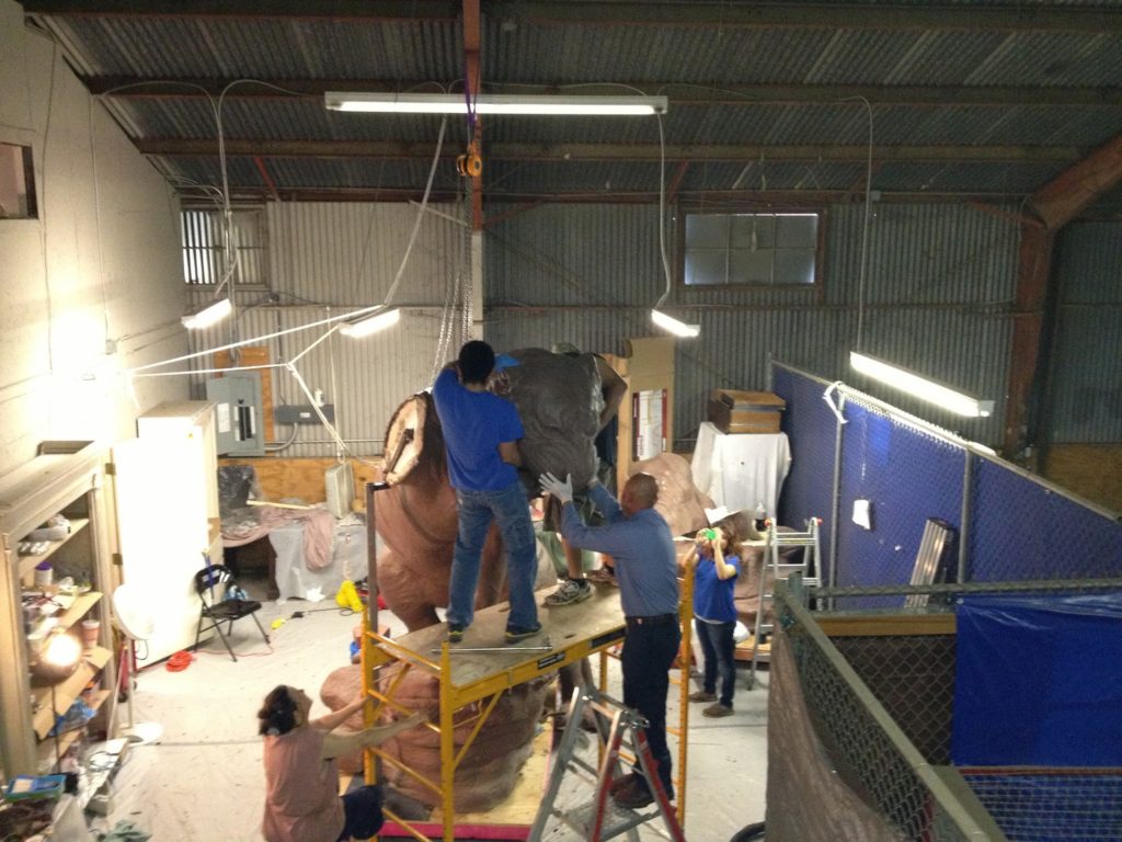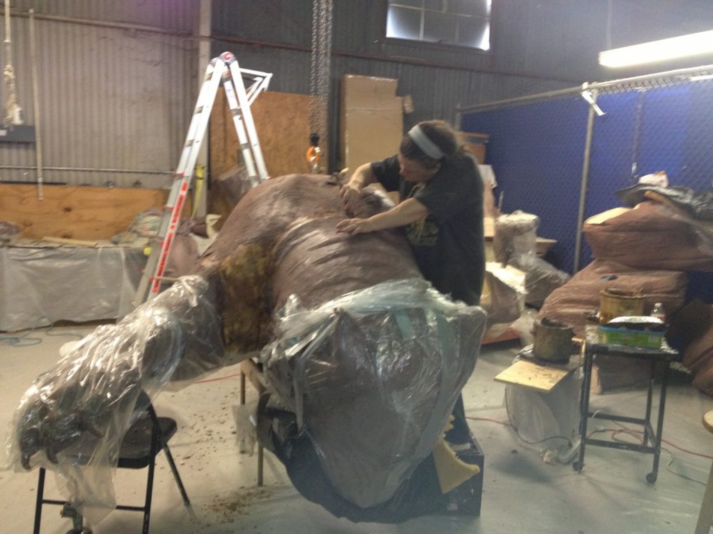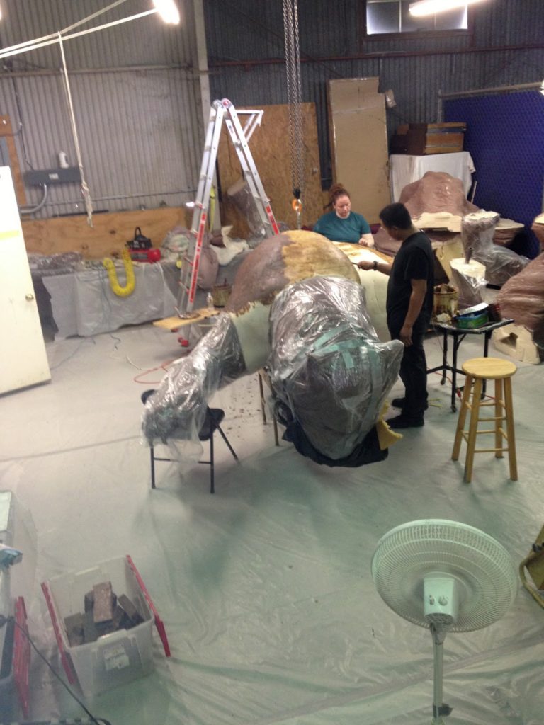 The head can not stay on the body for long. It is so hot in the warehouse we are afraid it will melt way up there. Sometimes I wish everyone had an artistic eye and could picture it together even though it is in pieces. Still , I’m excited about seeing all the pieces