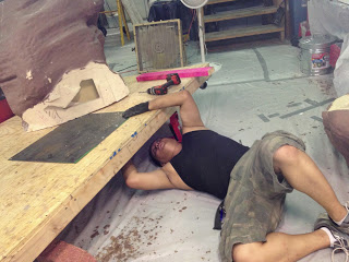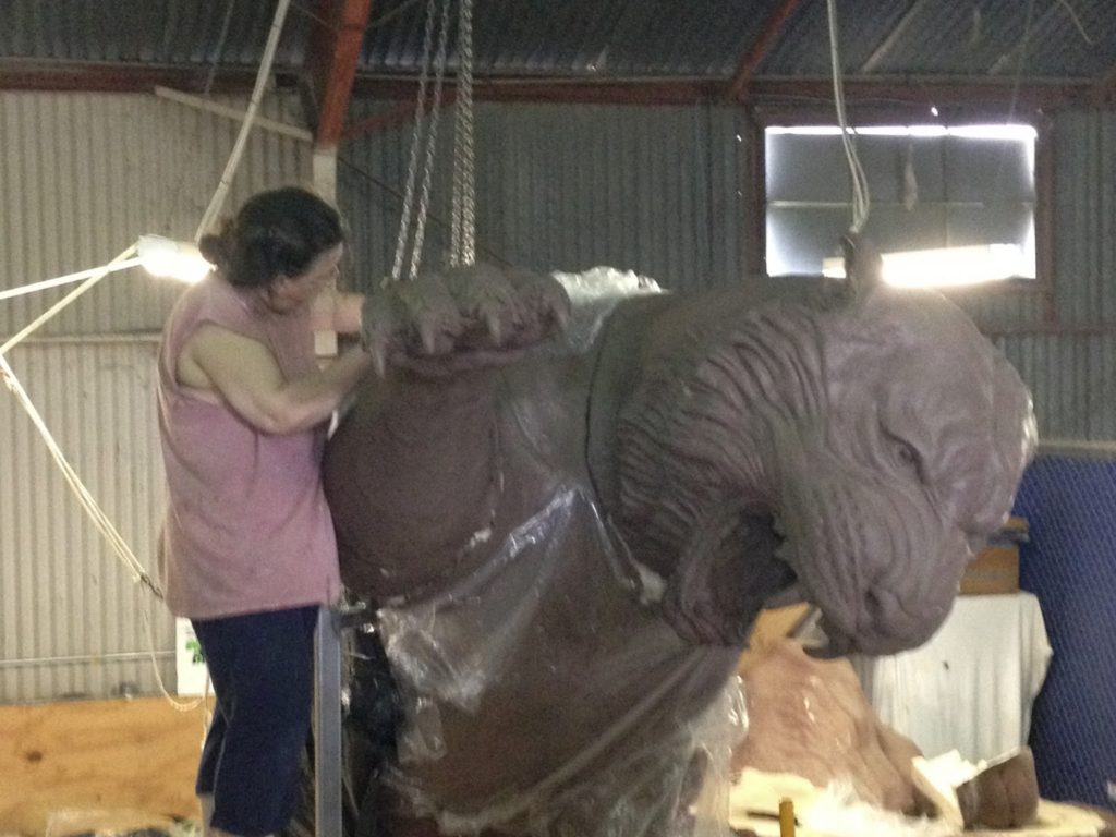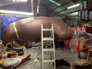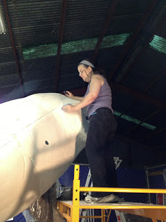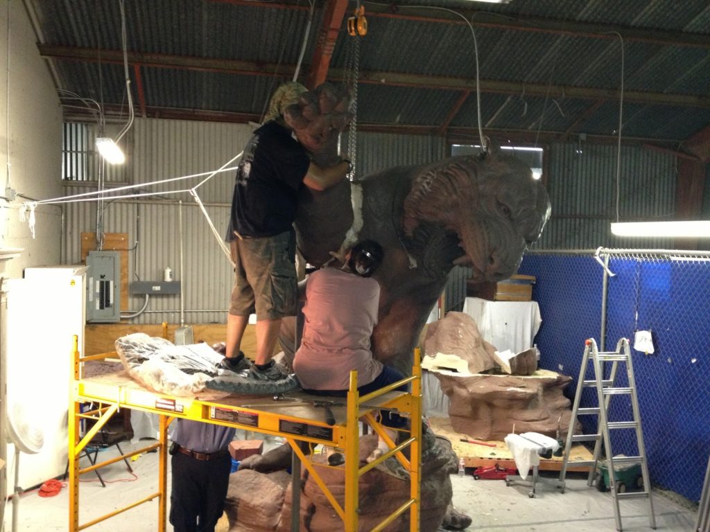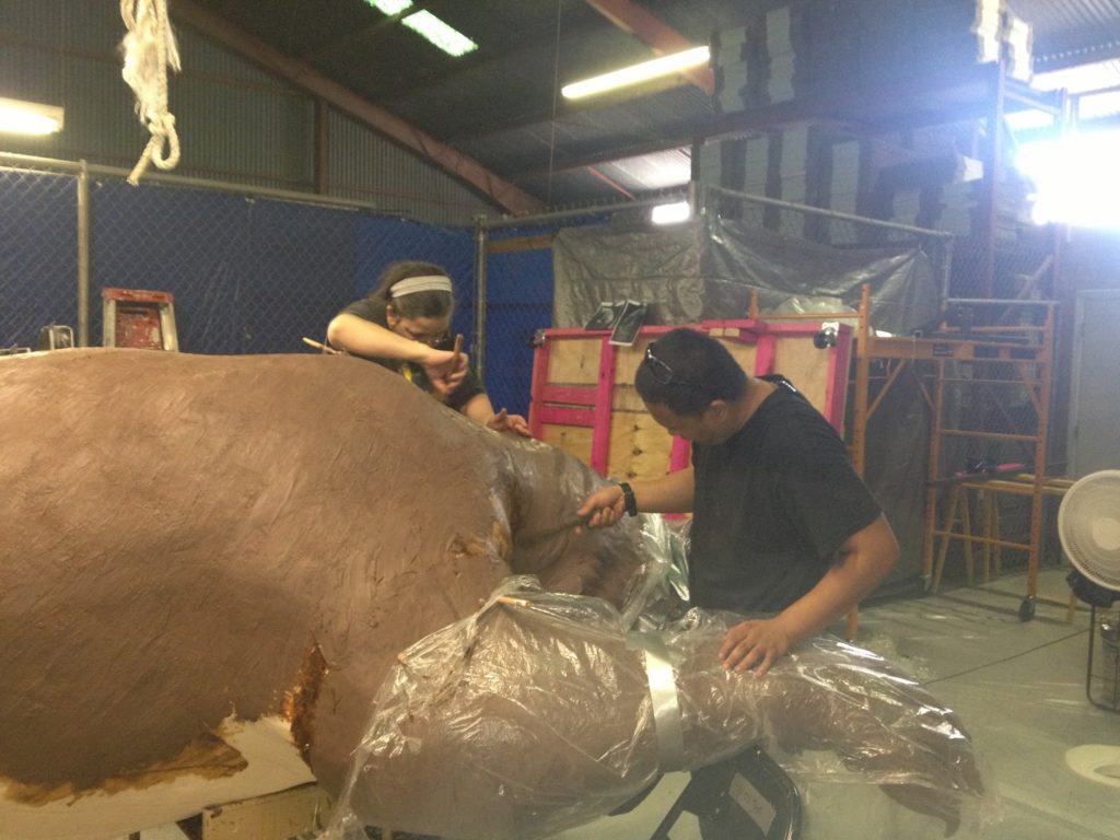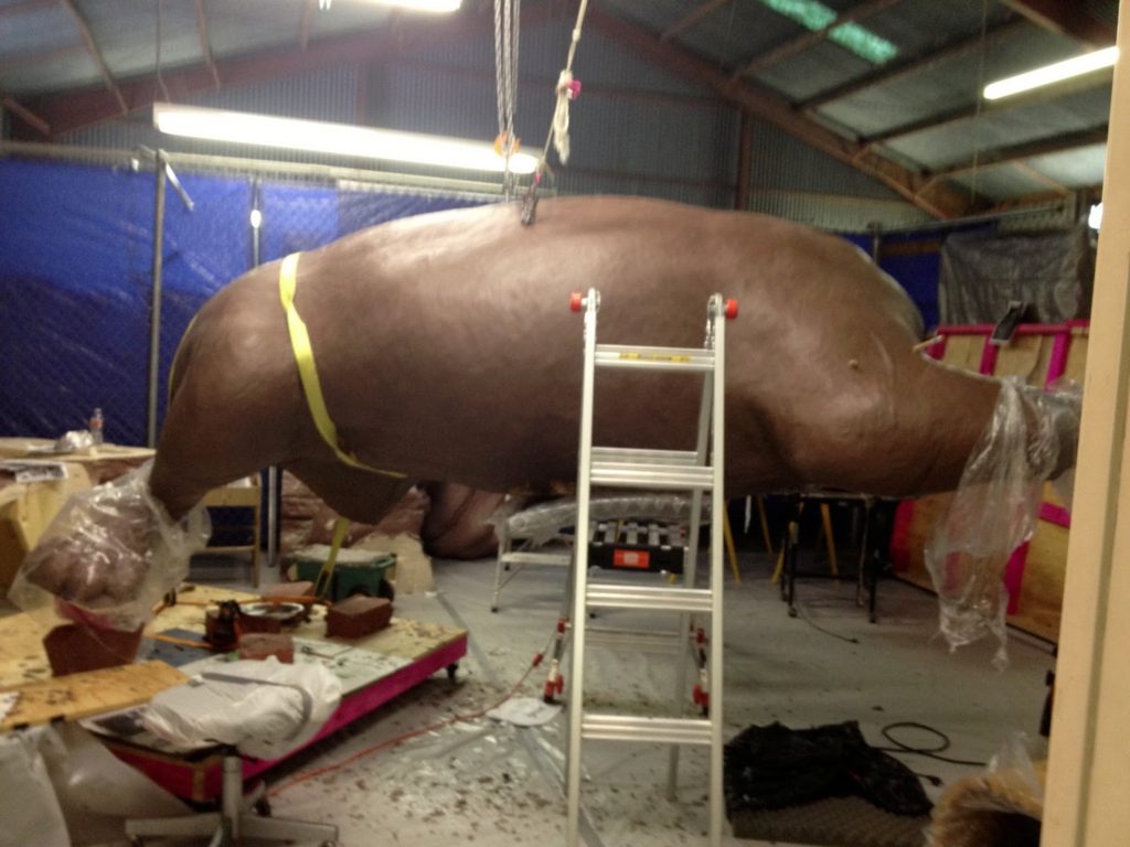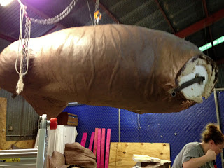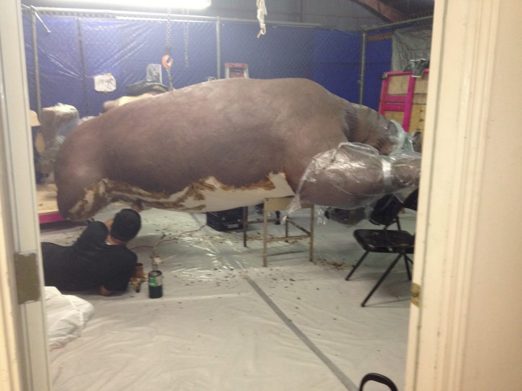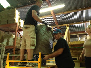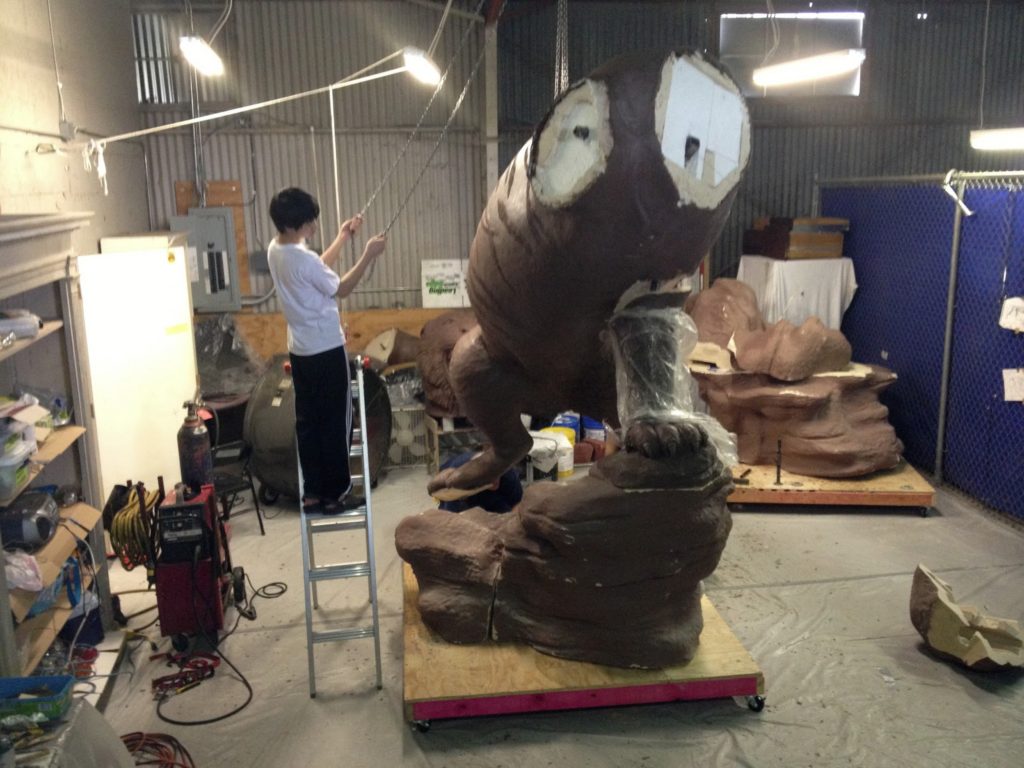 The head can not stay on the body for long. It is so hot in the warehouse we are afraid it will melt way up there. Sometimes I wish everyone had an artistic eye and could picture it together even though it is in pieces. Still , I’m excited about seeing all the pieces