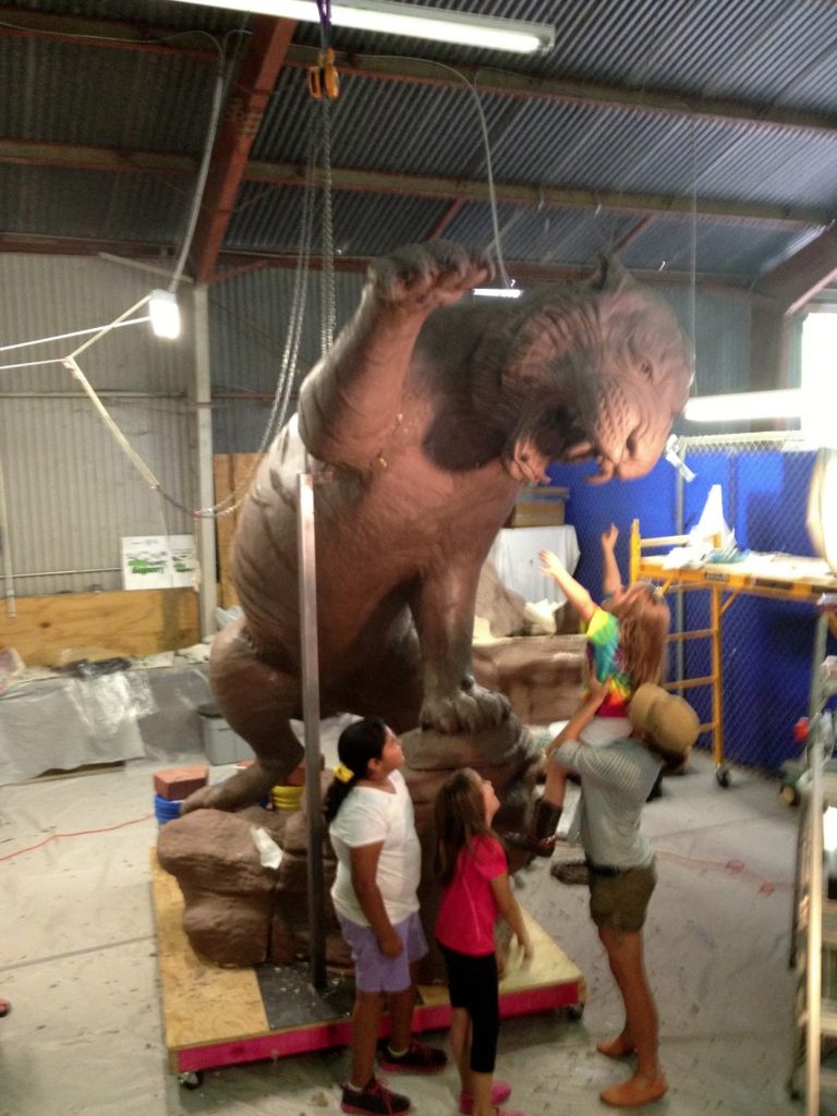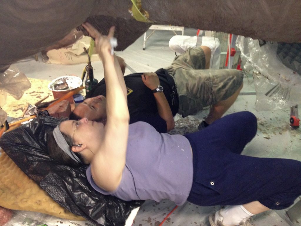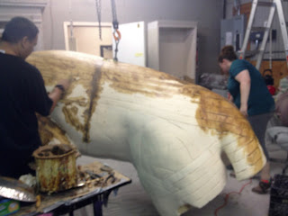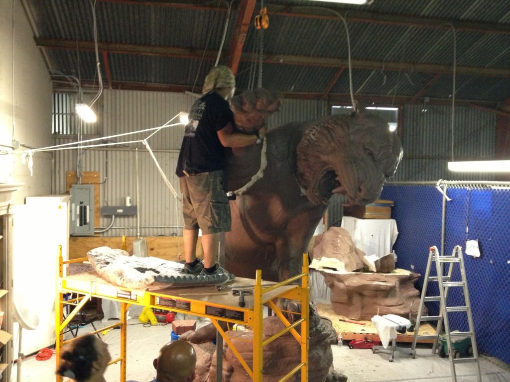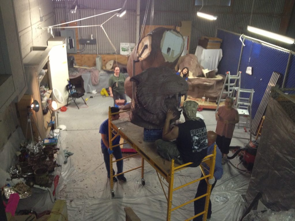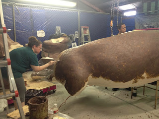 It is Tuesday. I’m writing this post from the warehouse. I am ever so thankful that a welder is coming this afternoon after 3:00. Our job- to complete stripes on the back of the head and then take the head and front paw off. To lift the tiger up onto part of the rock and have it ready for the welder to secure it. Then we can put the head and paw back on. Head and paws are heavy and it is hot up at the top of the warehouse . We are all praying for the safety of the tiger and the workers in this part of the process.