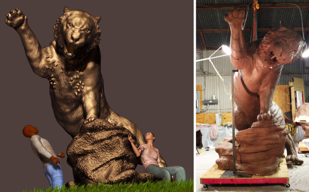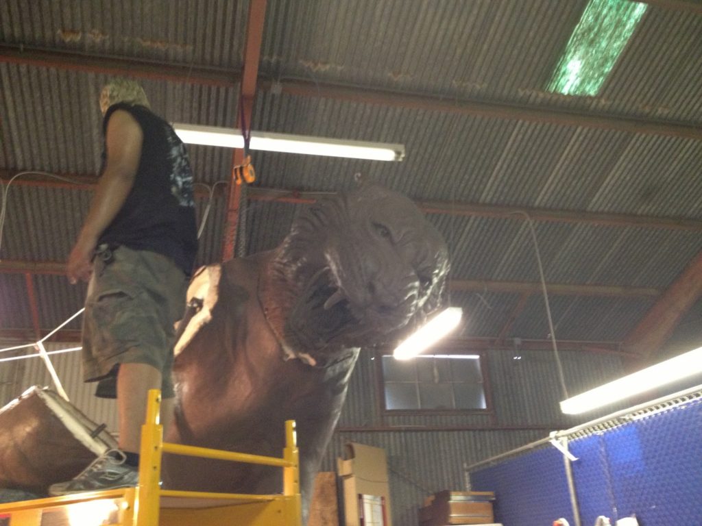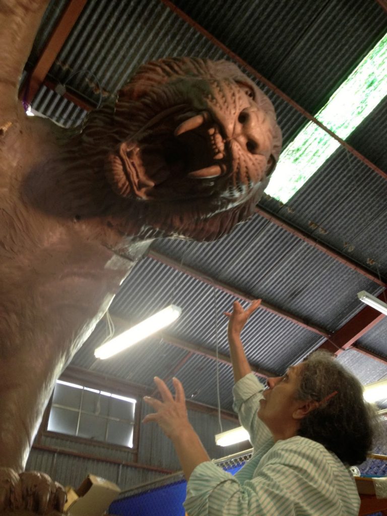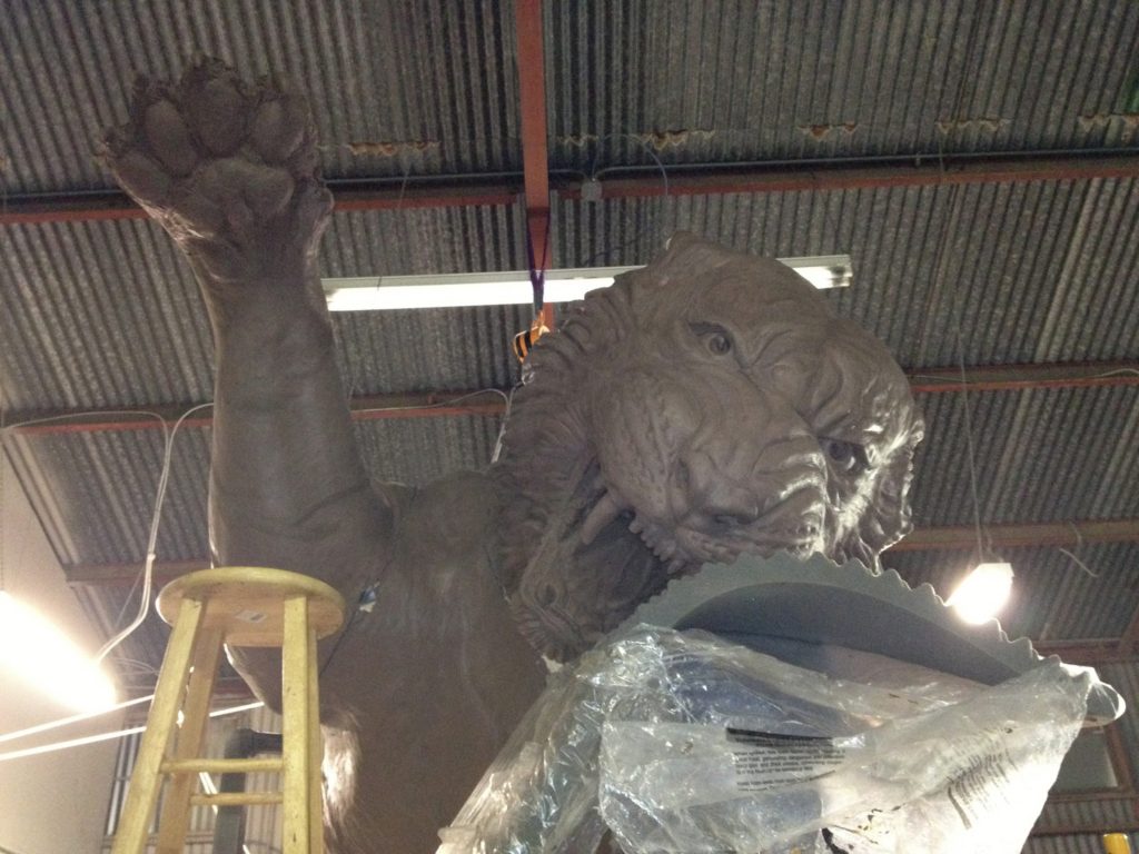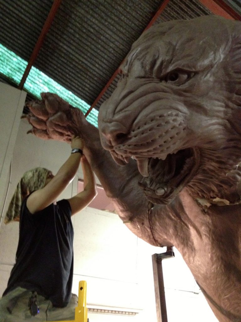 When I told Allison about my thoughts, she did not hesitate about climbing up so high and helping. Allison, God bless you for your fortitude. She went up on the scaffold and helped me to lower the arm to check it out. I loved it! The sculpture looks more threatening.The tiger is not just raising its arm to attack but the paw is coming down on you! However, this minor adjustment meant that I had to spend 2 days up on the scaffold fixing the arm and the areas surrounding it. Well worth it.