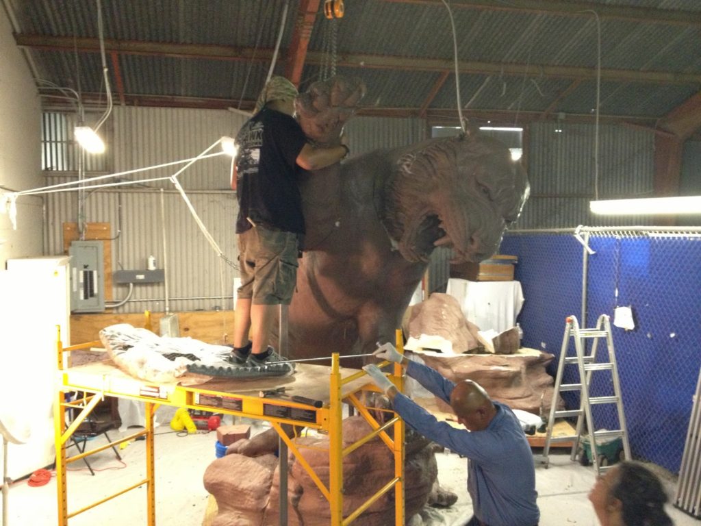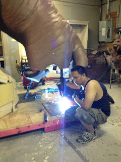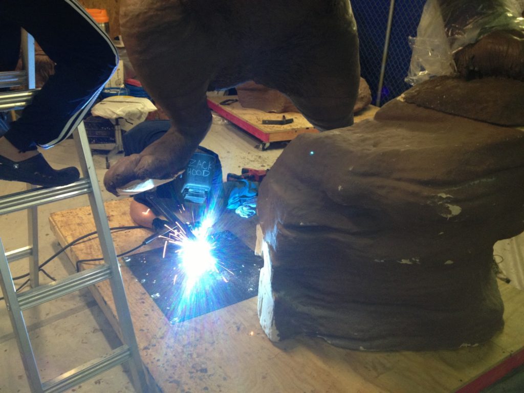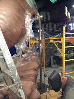 Ask and you shall receive. Thanks to my wonderful new warehouse roommates, they have access to a welder. There is a fear that the head and paw have so much weight on them that once attached the tiger will fall over. Also, there is no way to raise the tiger with the head and paw on as it is so much weight in the front. So, I have hired a welder to come in and give it extra support. I am doing this for no other reason than to see the entire cat together an get approval. It only needs to stay like this for a couple of days and then it comes all down again.