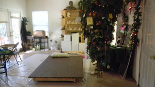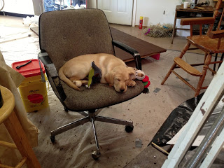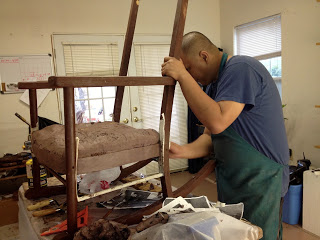 There is still much work to be done on the chair. James smooths out the base of the chair to represent wood and then Antoinette painstakingly adds many, many carpet tacks. We also have a studio visitor. An intern brings a family Christmas present. OK we might not have gotten as much work done when Daisy arrived, but I really enjoyed having her.