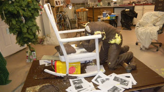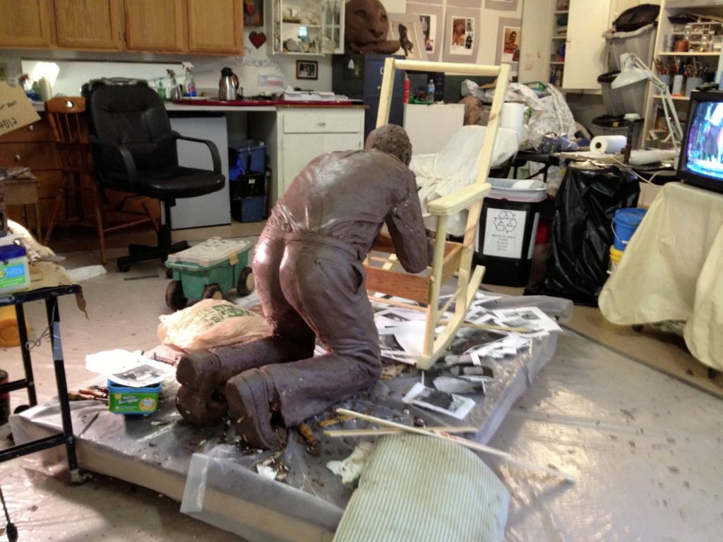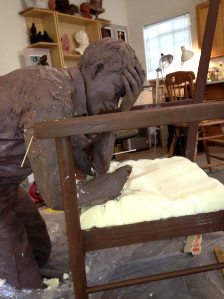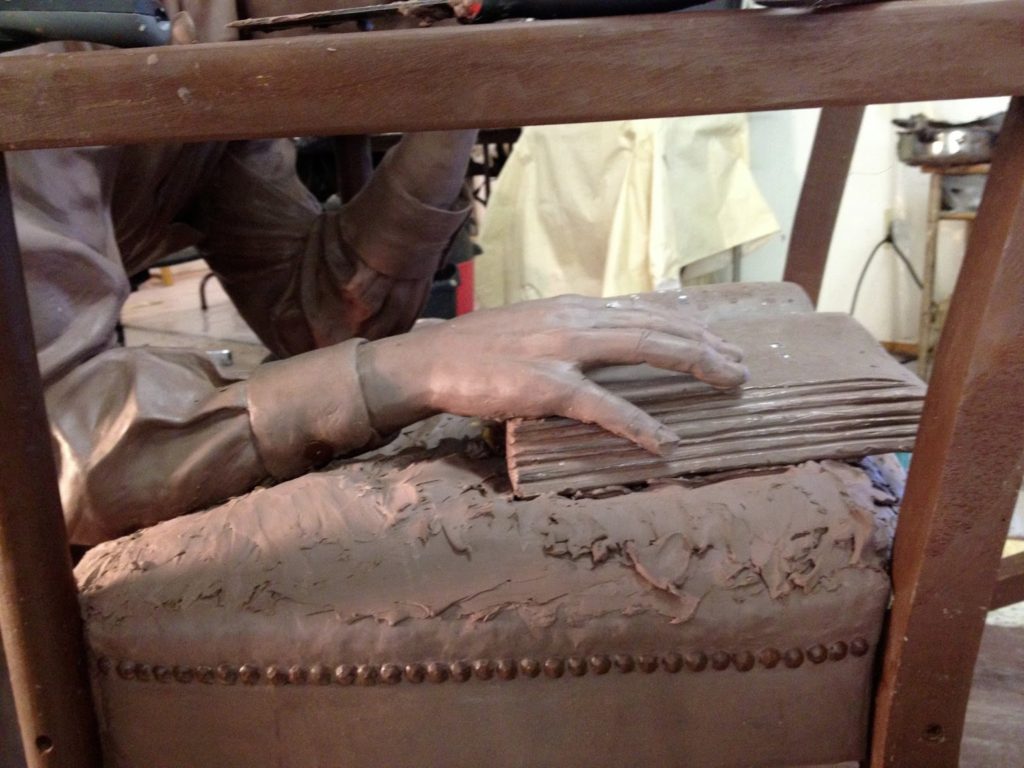 There are so many elements to this sculpture. There is the man, the chair, the cushion, the floor, the placement of the hands and arms, and the creases in the chair, the folds in the pants. We keep putting things together and creating and then taking them apart and working on them.