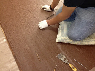 When you have many interns on a project, there are multiple things happening at the same time. After roaming and searching for just the right texture for the floor of this sculpted scene, I have found wood that will work. I prefer to have a wooden base rather than a sculpted base as the floor gets much use from moving things on and off. One of my interns comes in and makes a rolling base for the sculpture and the floor. James, another intern spray paints the base a brown color. I like to have everything the same color as the clay that I am using. It helps me to see the projects as a uniform piece and offers less visual distraction. I also think it helps the client to see the sculpture. James also fills in the cracks.