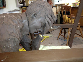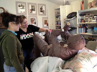 OK well not flipping out, it is more like flipping over. Another thing that interns help me with is smoothing the clay. Often times I’ll work late into the evening, adding clay and taking away, and they come in the next day only to have to clean up a mess and smooth out the clay. Slowly we begin to add the details into the sculpture, the folds are a key to making the sculpture look like it is real and has action. They take a lot of work.