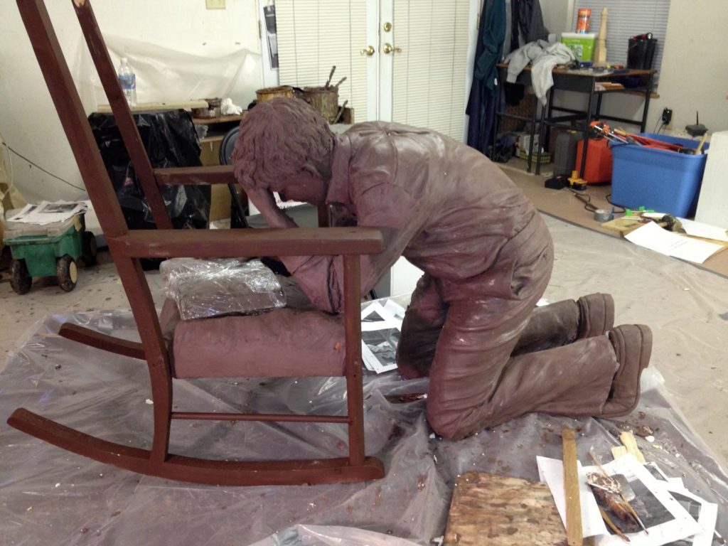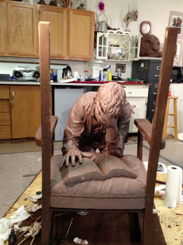 You have a “God given talent”, people say. I humbly agree that the passion that comes from my hands is greater than the human artist. My creative process is one filled with revelation. I feel the Holy Spirit speaks to my heart, and somehow that Spirit comes through my hands. I wanted to share a bit of that with you, as well as the pictures that you requested I send before you come.After approval, it will take a week to get the sculpture through the beginning of the foundry process. To do this we need to cut the man and chair into about 10-15 pieces. At this time, we work on some more detail and smoothing. It is a lot easier smoothing the underside of something when it is a small piece and flipped on a table as you sit upright rather than reaching around appendages or balancing upside down.